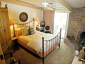 southwest patterns cover the queen iron bed. The private bath is