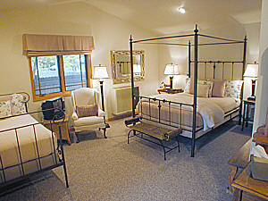 queen-size iron bed, soft chair and a whirlpool tub in the